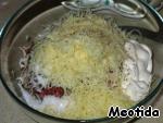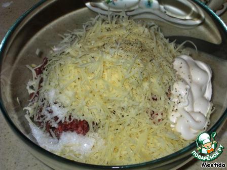 чеснок мелко нарезаем, сыр трем на терке, смешиваем с фаршем, яйцом и сметаной, приправляем солью и перцем по вкусу -