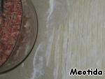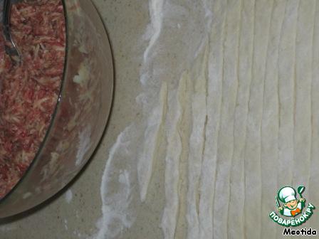 Тесто делим пополам, раскатываем на присыпанной мукой поверхности в пласт и нарезаем полосочками
