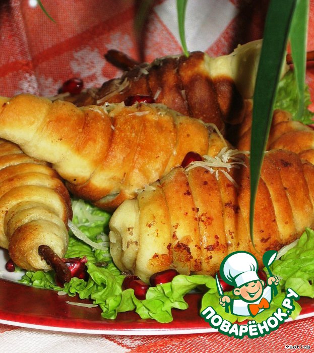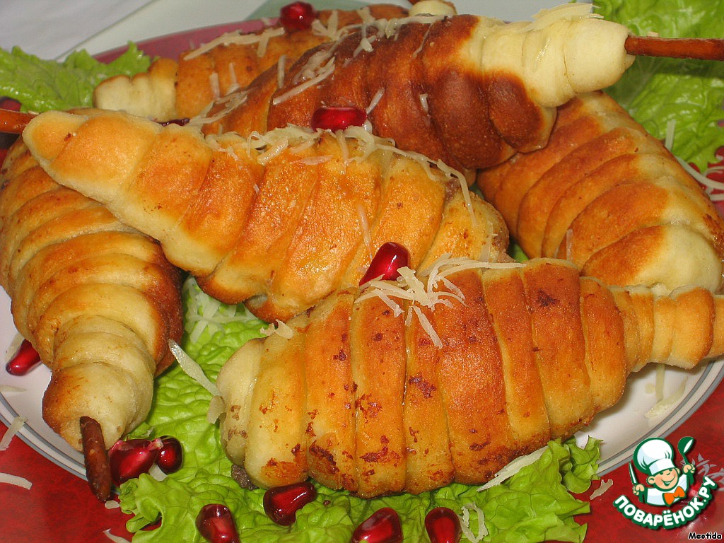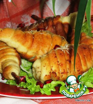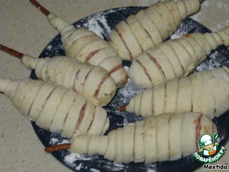 ... "Мама, мама... а то это за стучки?... а это мозя кусять... да?... а мозя я сьем одну и моeму дугу Киюхе тозе дам?"... и счастливые любимые глаза дочери, смотрят с восторгом на тебя и на пирожки.. и сердце наполняется бесконечной нежностью.. и хочется подарить ей весь мир и сделать так, чтобы все желания моментально исполнялись.. и пусть бабушки говорят, что нельзя баловать ребенка, хотя сами балуют тааааак, что нам в детстве и не снилось:)... и еще, как и любой маме, хочется вкусно.. разнообразно и полезно накормить карапузика... а когда на тарелке лежат такие миленькие гусенички.. даже взрослый начинает чувствовать себя ребенком, и хочется стащить еще одну.. Рецепт этого блюда был размещeн на сайте в 2008 году пользователем Sidna под названием "Пирожки "Куриные ножки" и иллюстрирован мной в рамках акции "Раскраски".
