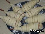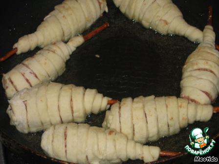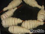 Теперь надо полоску теста обкрутить вокруг фарша, начиная с серединки соломинки, если одной полоски не хватает, то берем вторую, соединяем между собой две полосочки капелькой воды