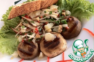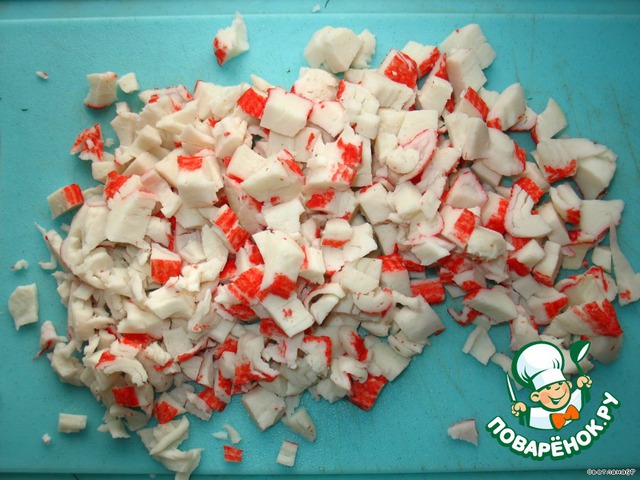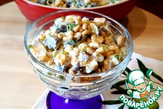 Салат приготовлен на основе салата Ruffo (автор Мама М. и А. ). Я решила заменить сырые грибы маринованными, ну и заодно добавила пару новых ингредиентов. С разрешения автора публикую свой вариант. Спасибо за идею сочетания грибов и крабовых палочек в одном салате, раньше я так не делала:-)