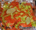 После выложим в глубокую сковородку или форму для запекания рыбку, на нее пережарку, нарезанный полосками болгарский перец, лавровый лист