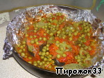 Затем выложить зеленый горошек, залить жидкостью от него (или водой). Я еще посыпала готовыми специями для рыбы.