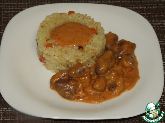 Обжарить на сковородке лук, выложить сюда же сердечки вместе с маринадом и тушить 15 мин.