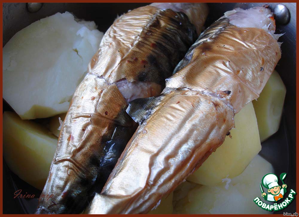 Разделать рыбу вдоль хребта на две половины и уложить на сварившийся картофель срезом вниз, потомить 4-5 минут под крышкой. |