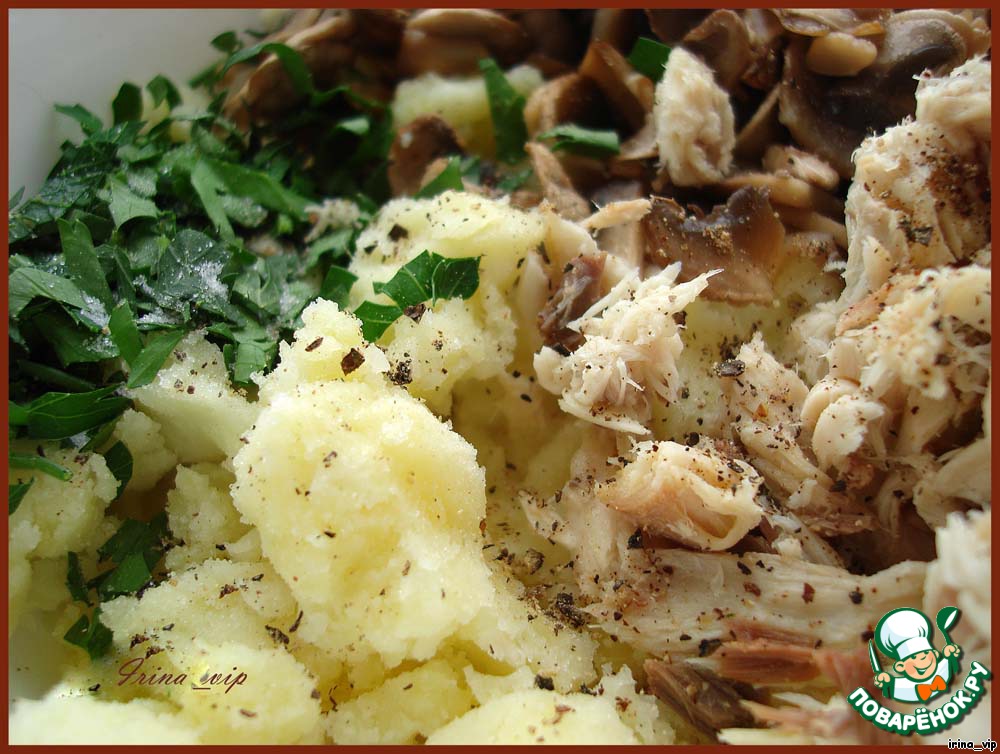 В картофельное пюре добавить рыбу, обжаренные грибы, зелень, поперчить. |