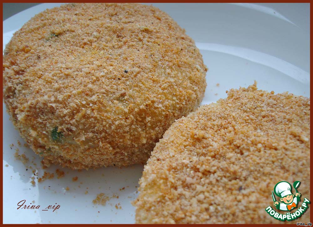 Запанированные в муке котлеты смочить во взбитом яйце и обвалять в панировочных сухарях. |