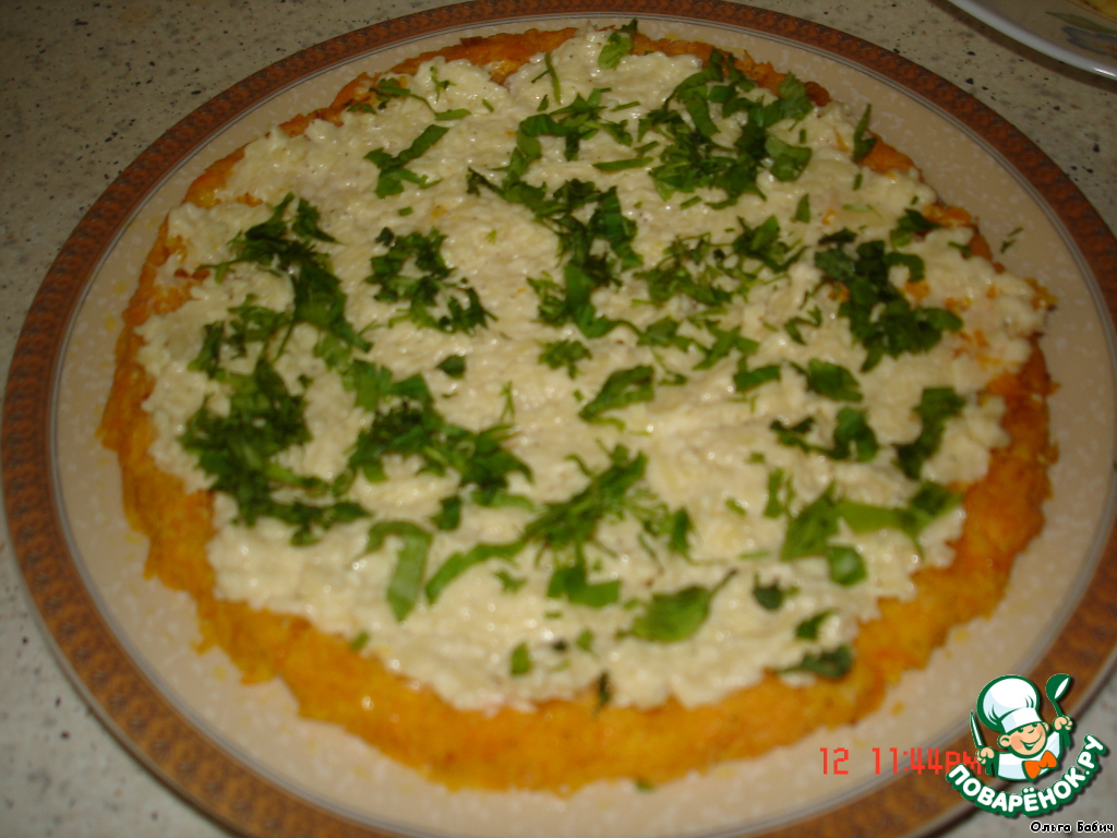 Я укладывала морковный-сыр со сметаной,картофельный,опять сыр и последний-морковный блинчик.