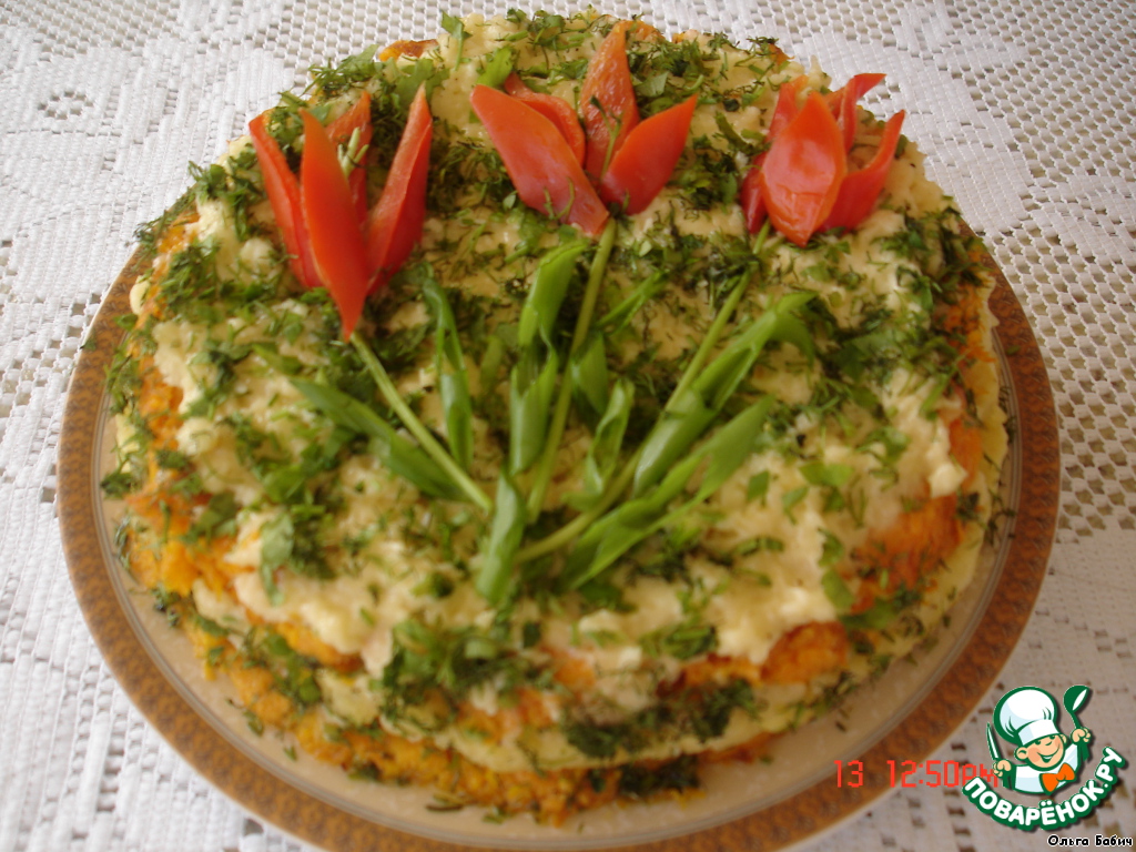 Легкий в приготовлении, нежный по вкусу, овощной торт с сырной прослойкой.