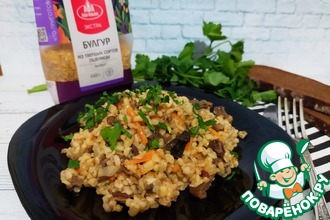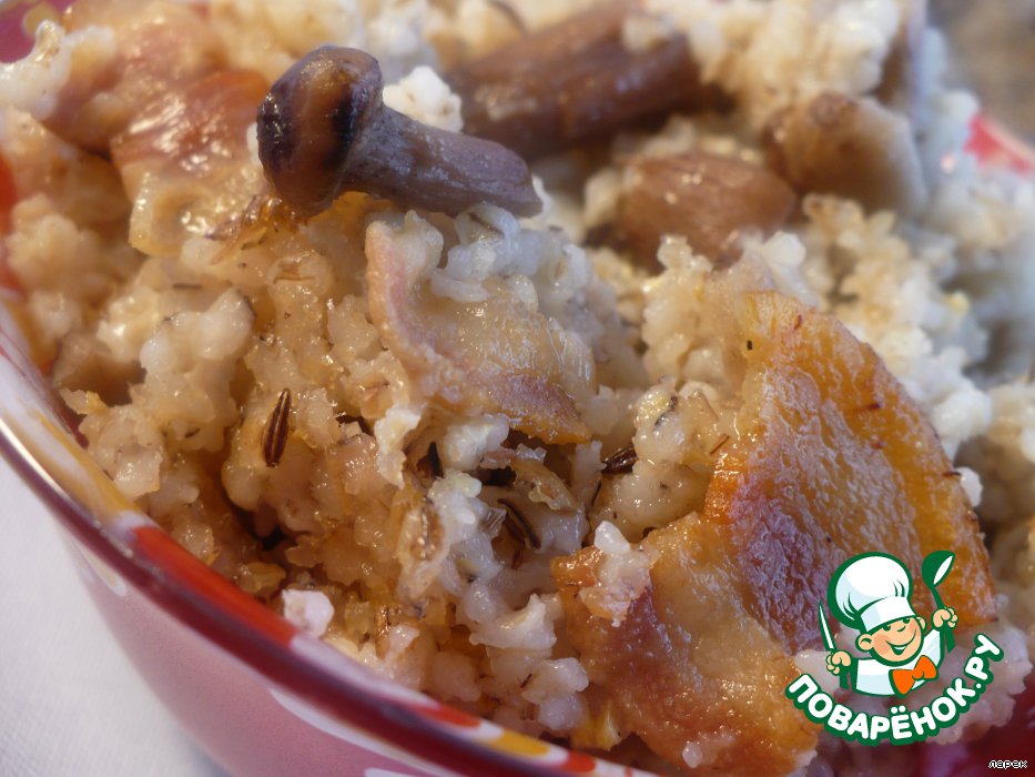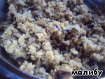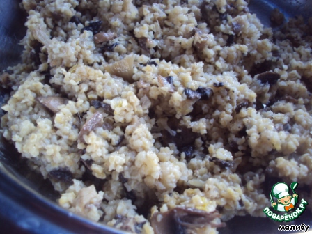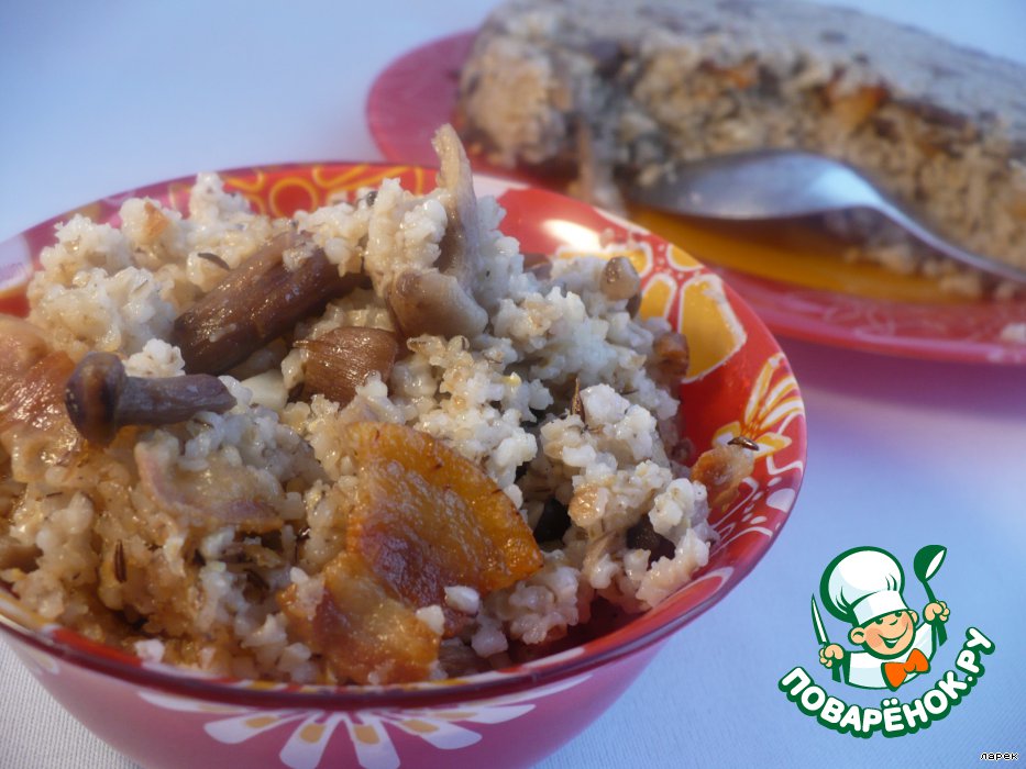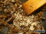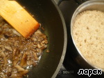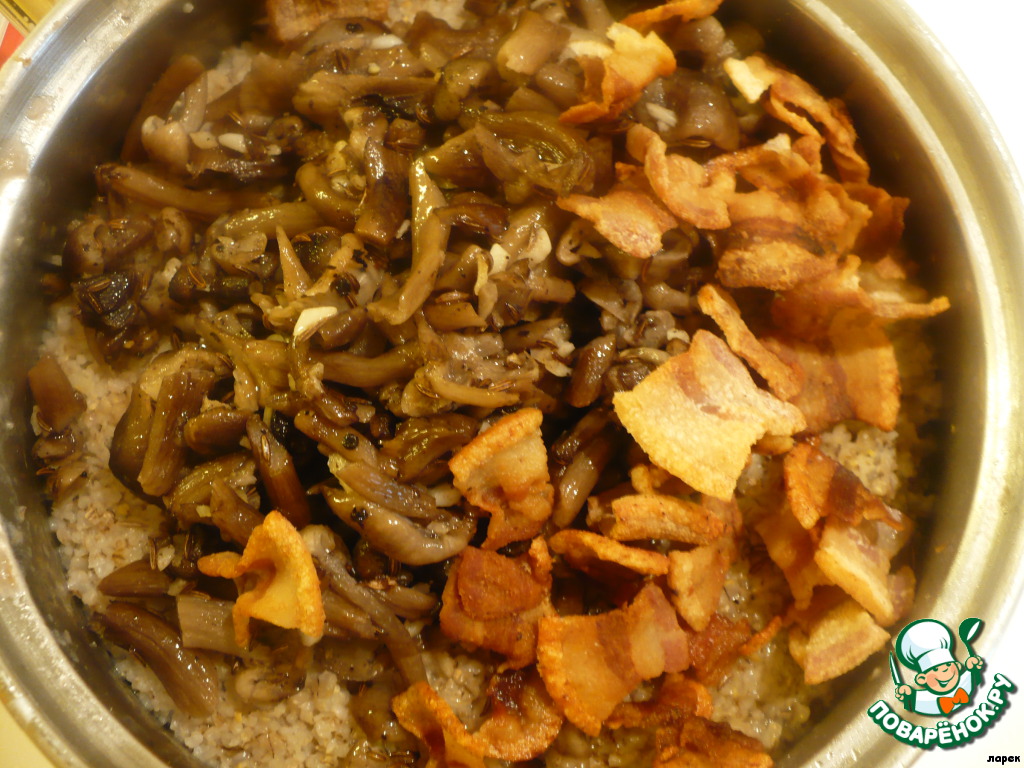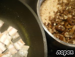 Добавить в кастрюлю к каше с грибами (вместе с вытопившимся салом). Перемешать.