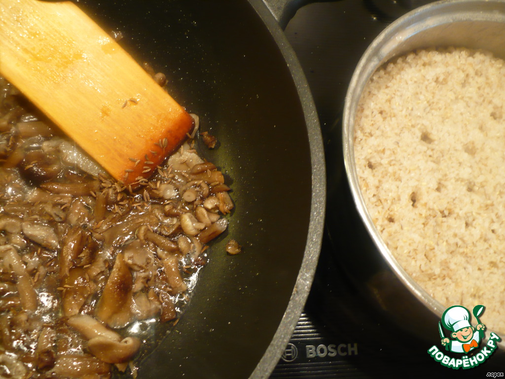 В кастрюлю влить воду, посолить, довести до кипения, всыпать крупу и варить до готовности. Грибы помыть, нарезать и поджарить с солью и тмином 15 минут.