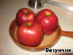У меня яблоки крупные - красавцы, поэтому я взяла 3 яблока, поместила их в жароупорную форму, долила немного воды и запекла в духовке при t 200 около 30 минут. Яблоки наколола ножом. Меньшие яблоки потребуют меньшего времени запекания.