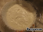 Получившееся яблочное пюре смешать с сахаром и яичным белком, должна получиться однородная масса. Эту массу взбиваем миксером до тех пор, пока она не станет густой и белой. Пюре лучше хорошо охладить (можно в морозильной камере), я этого не сделала, поэтому всю массу два раза ставила в морозилку минут на 5.