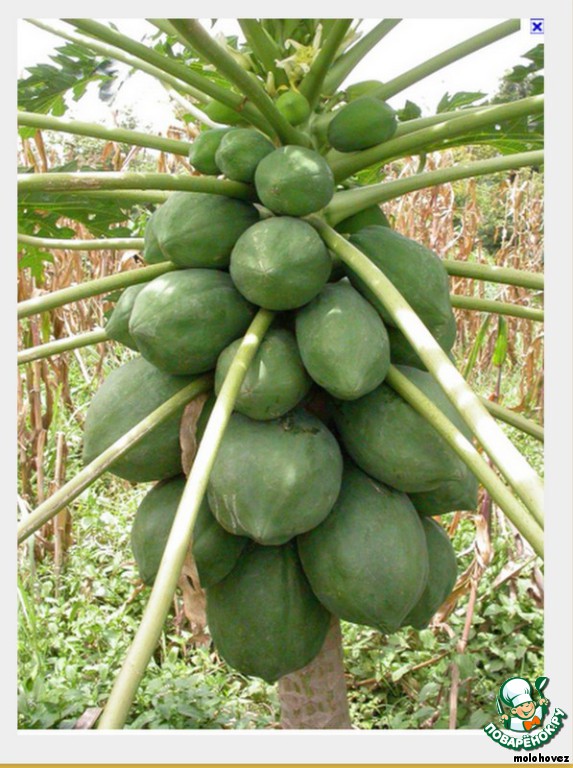 Описание: Если бы можно было скрестить тыкву с дыней, то, наверно бы, эксперимент закончился папайей! Не зря древоподобное растение, на котором произрастают плоды папайи, еще называют и дынным деревом.