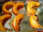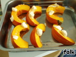 положить на противень, сверху масло (25 гр) и запекать при 180*С минут 30 (зависит от тыквы).