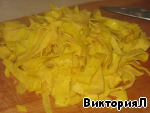 Для начала из яиц, с добавлением соли и перца, пожарить тонкие блинчики. Потом порезать их соломкой шириной 1см.