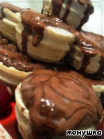 Пока они пекутся, сливки разогреваем и топим в них шоколад, охлаждаем и взбиваем. Сахарную пудру разводим водой, чтобы получилась глазурь.