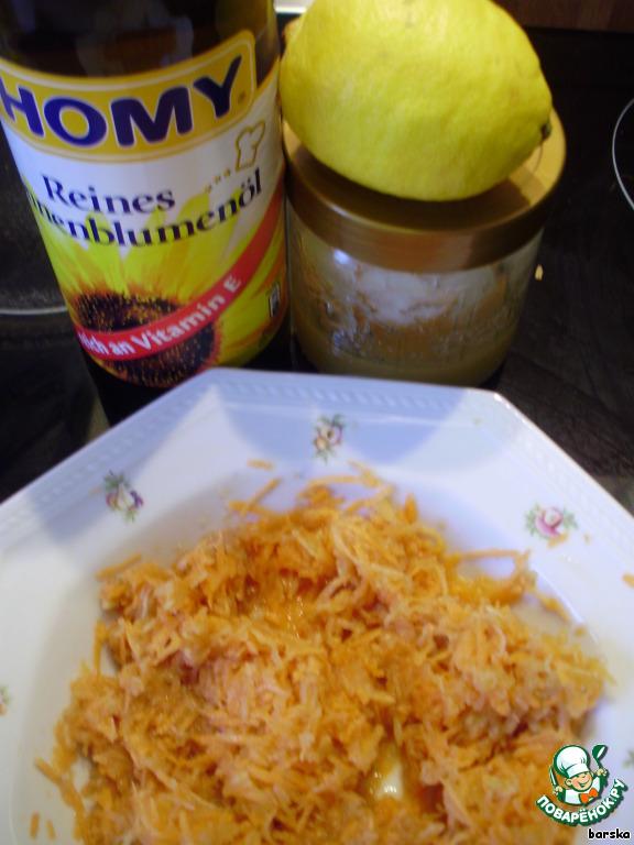 Яблоки и морковь очистить и натереть на мелкой тёрке. Добавить лимонный сок, растительное масло, мёд |