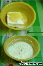Отруби, творог, сметану, сахарный песок, сливочное масло перемешать (не миксером), посолить.