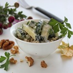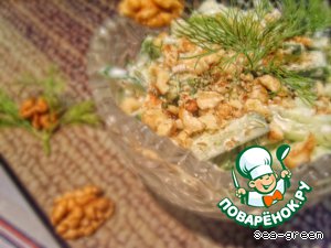 Вроде обычный и стандартный салат из нескольких всем до боли известных компонентов, НО вот грецкий орех свое дело сделал! Получилось вкусно, не стандартно и интересно!