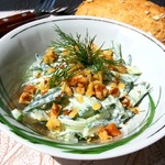 • Добавить измельченный чеснок, зелень укропа, перец чили, сметану и хорошо перемешать.