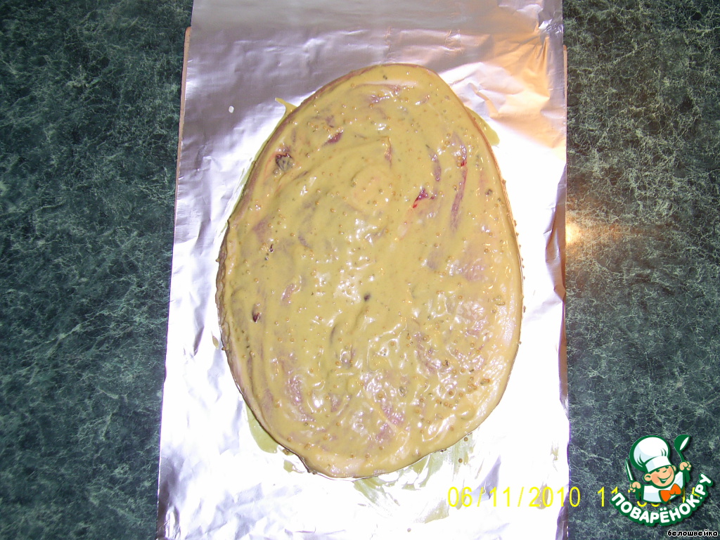 • Обмазываем мясо. Заворачиваем в фольгу и в холодильник на пару часов. Я люблю этот полуфабрикат приготовить с вечера, за ночь мясо хорошо пропитается, а с утра в духовочку, разогретую до 220 град. часа на полтора, в зависимости от мяса иногда больше времени уходит на пропекание.