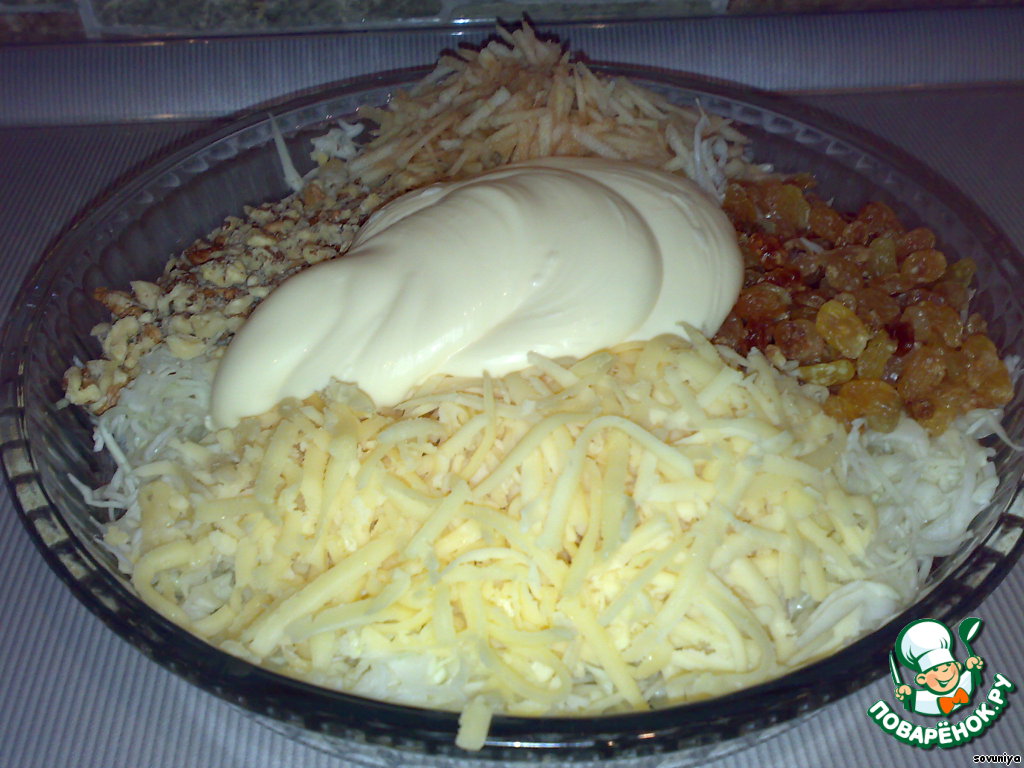 Лeгкий закусочный салатик для ужина. Капустка и сыр дают насыщение, изюм и орешки питают мозг, а яблочко - это витамины. Очень быстро готовится.
