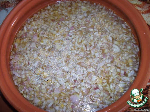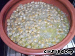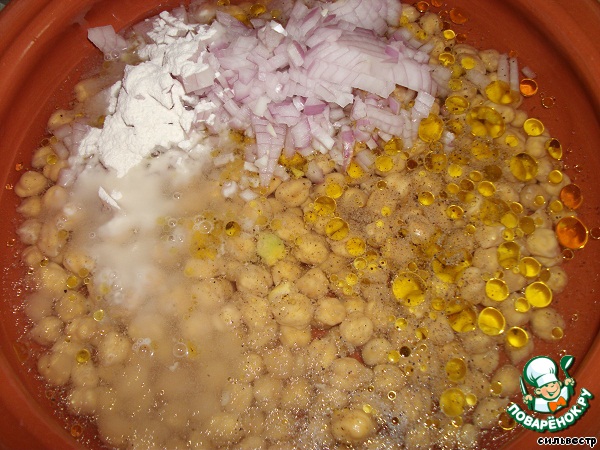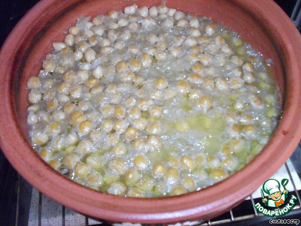Нут замачиваем на ночь в большом количестве воды с 1/2 ч.л. соли. Промываем его и кладем в жаровню или горшочки вместе с мелко нарезанным луком, солью (при замачивании с солью он не стал соленым), перцем, мукой и маслом.