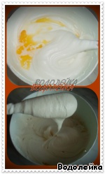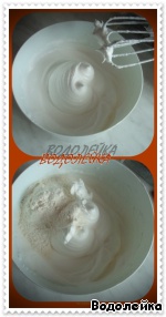 • Яичные белки взбиваем в крутую пену, под конец добавляем сахар (или пудру) и еще немного взбиваем.