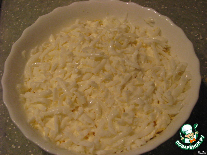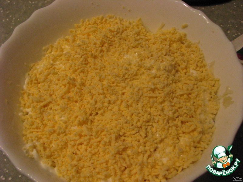 • Слой желтка, натертого на мелкой терке, с майонезом.