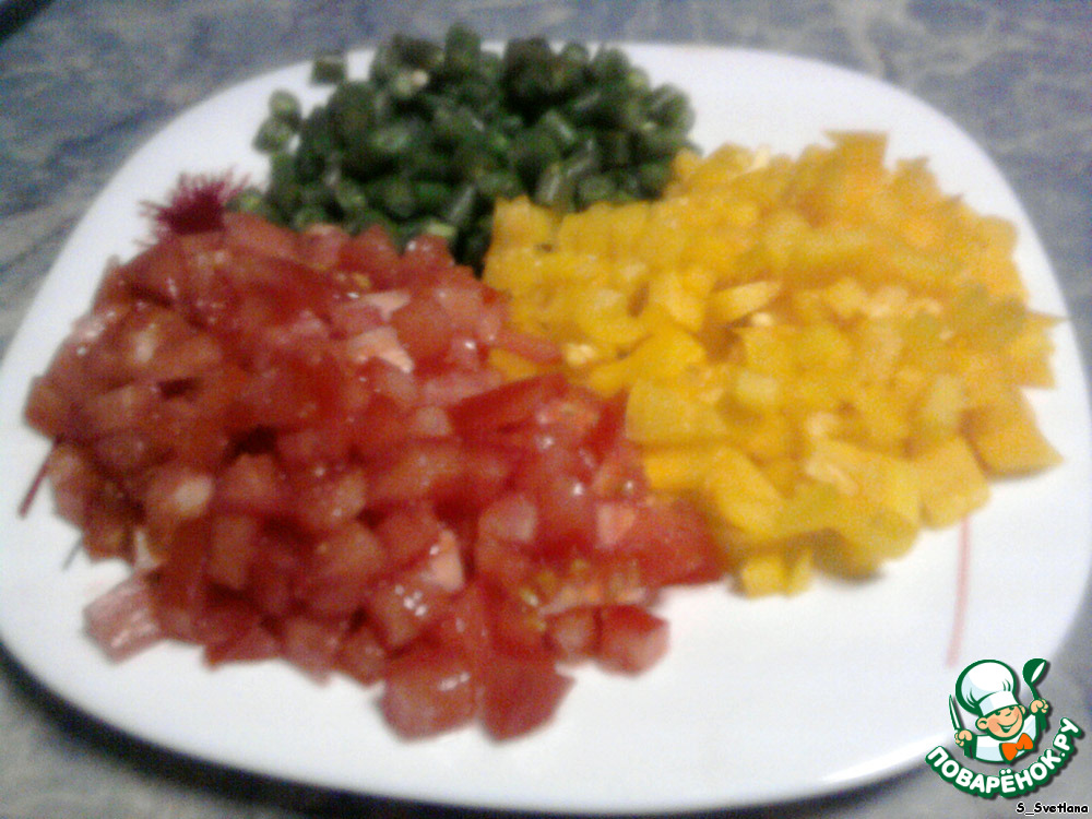 Режем помидоры, болгарский перец и остывшие стручки фасоли.