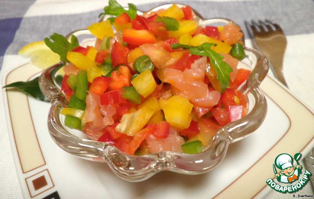 Салат очень легкий и простой. В то же время очень яркий и вкусный. Рецепт этого блюда был размещен на сайте в 2008 году пользователем "Люсиль" под этим названием и иллюстрирован мной в рамках акции "Раскраски".