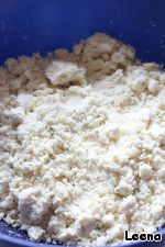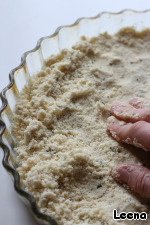 Тесто имеет структуру крошек. Широкую неглубокую форму смазать сливочным или растительным маслом. Высыпать все тесто и разровнять. Рукой хорошо утрамбовать пласт.