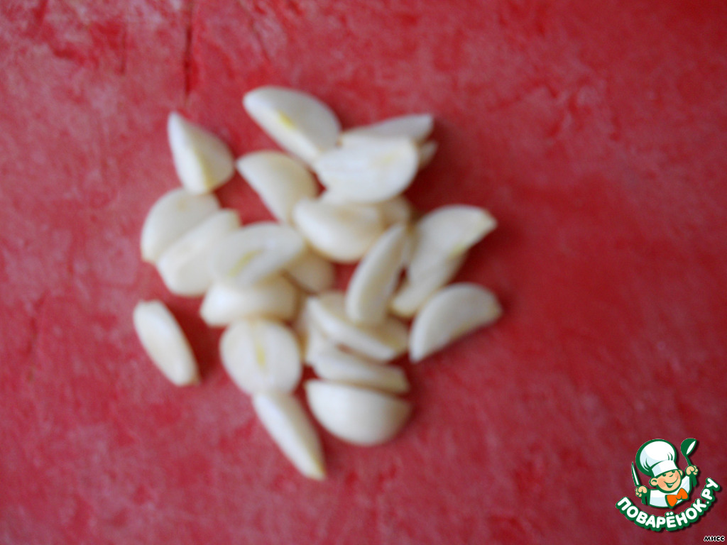 Чеснока берём побольше. Режем вдоль на 4 части каждый зубчик.