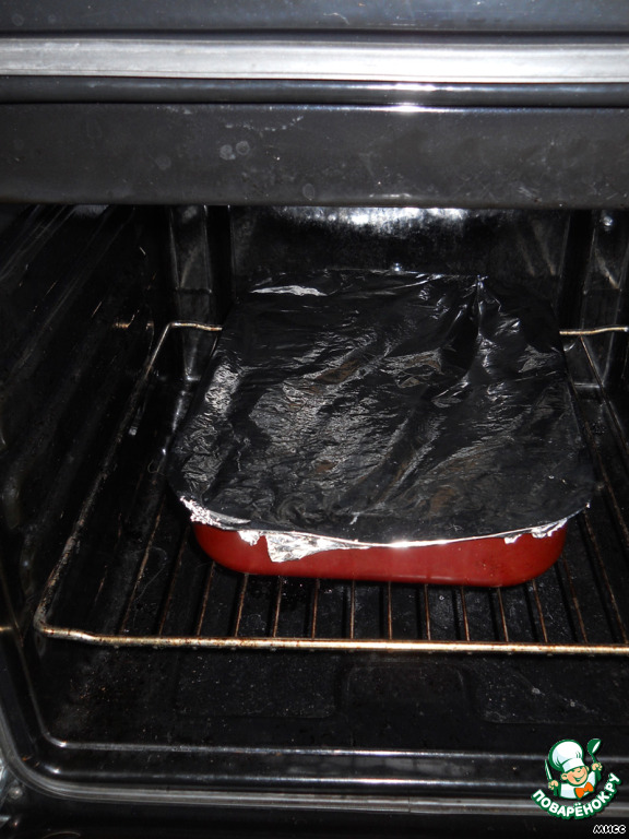 Далее форму накрываем фольгой и отправляем в духовку на 1 час при 220 градусах. Далее фольгу снимаем, там должно выделиться много сока, мясо переворачиваем и оставляем ещё на 30 минут для запекания до румяной корочки и выпаривания сока.
