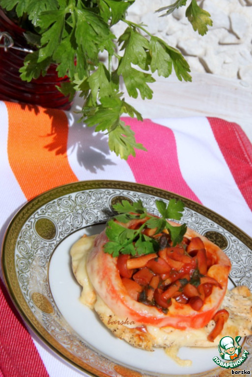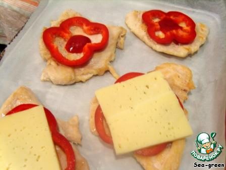 Противень застелить бумагой для выпечки, на него выложить обжаренное филе, сверху кружочки перца в виде цветочка, а на него тонкие ломтики сыра и поставить в разогретую духовку на 10-15 минут.