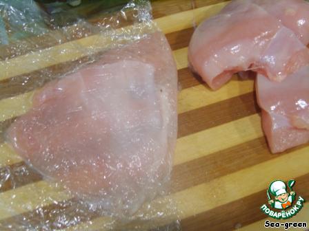 Куриное филе я разрезала пополам, получилось 4 кусочка. Их нужно отбить (очень удобно это делать через пищевую пленку), посолить, поперчить.