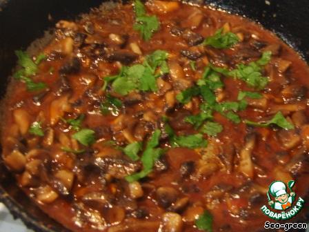 Для этого: шампиньоны почистить и мелко нарезать, обжарить на сковороде, добавить вино, томатную пасту, мелко нарезанную петрушку, соль, перец (если необходимо) и немного потушить. -