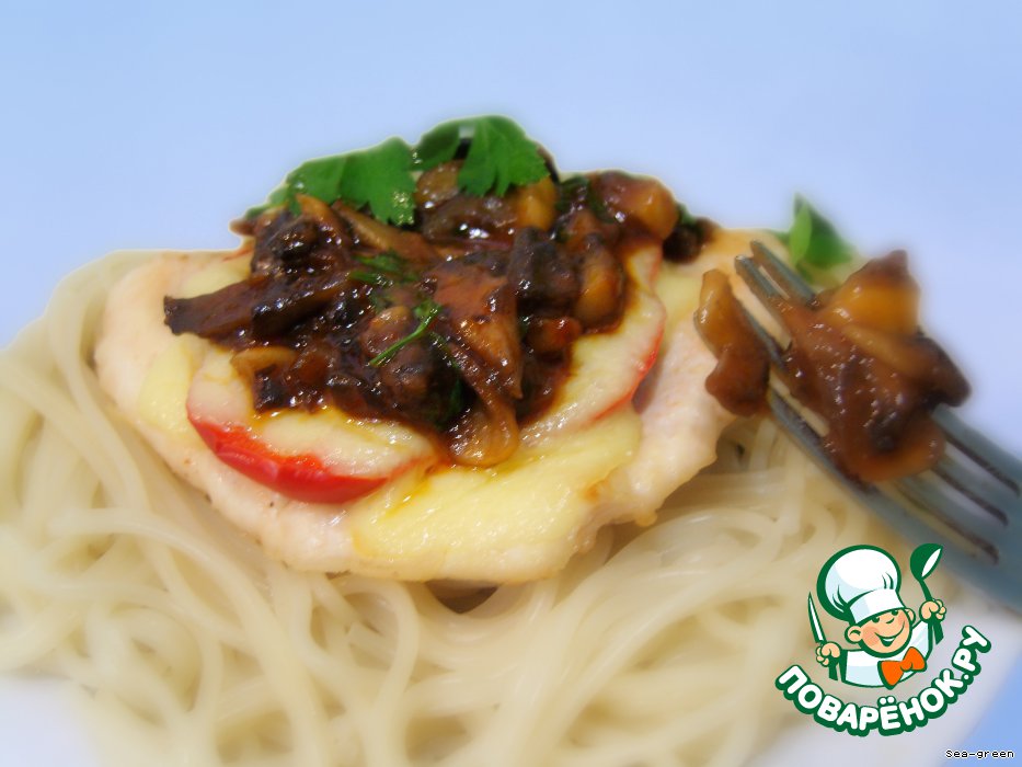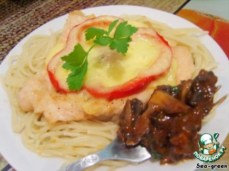Спустя 10-15 минут, когда сыр расплавится, можно доставать и наслаждаться. На гарнир автор советует пюре, но у меня были спагетти. Подавать вместе с соусом.