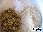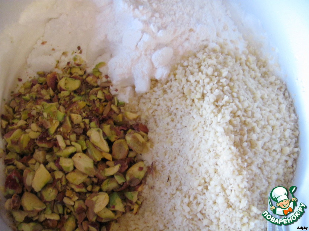 • Аккуратно ввести фисташки, миндаль и оставшуюся сахарную пудру.