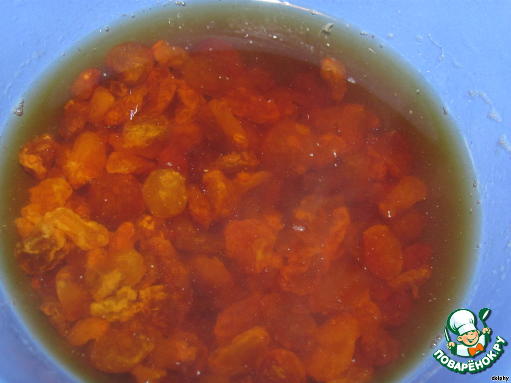 • Изюм замочить в горячем чае на 15 минут. Затем чай слить.
