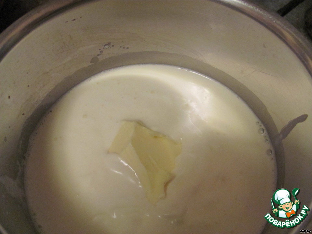 • Сливки с маслом довести до кипения (но не кипятить).