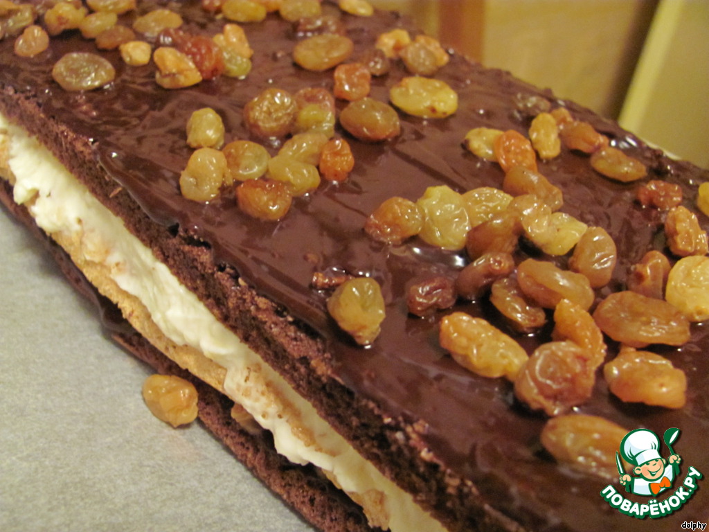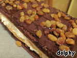 • Накрыть шоколадным прямоугольником, сверху - тонкий слой шоколада и оставшийся изюм.