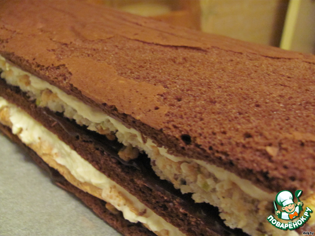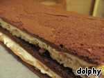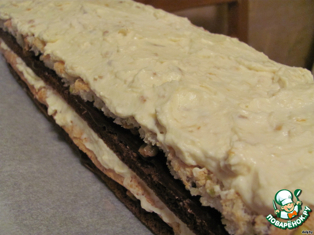 • Завершить торт шоколадным бисквитом. Один миндально-белковый прямоуголиник у нас остается. Его можно просто съесть :-)
