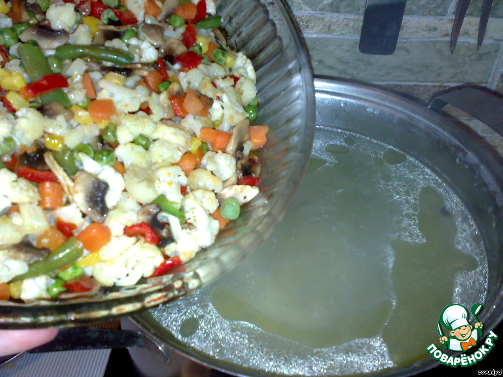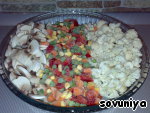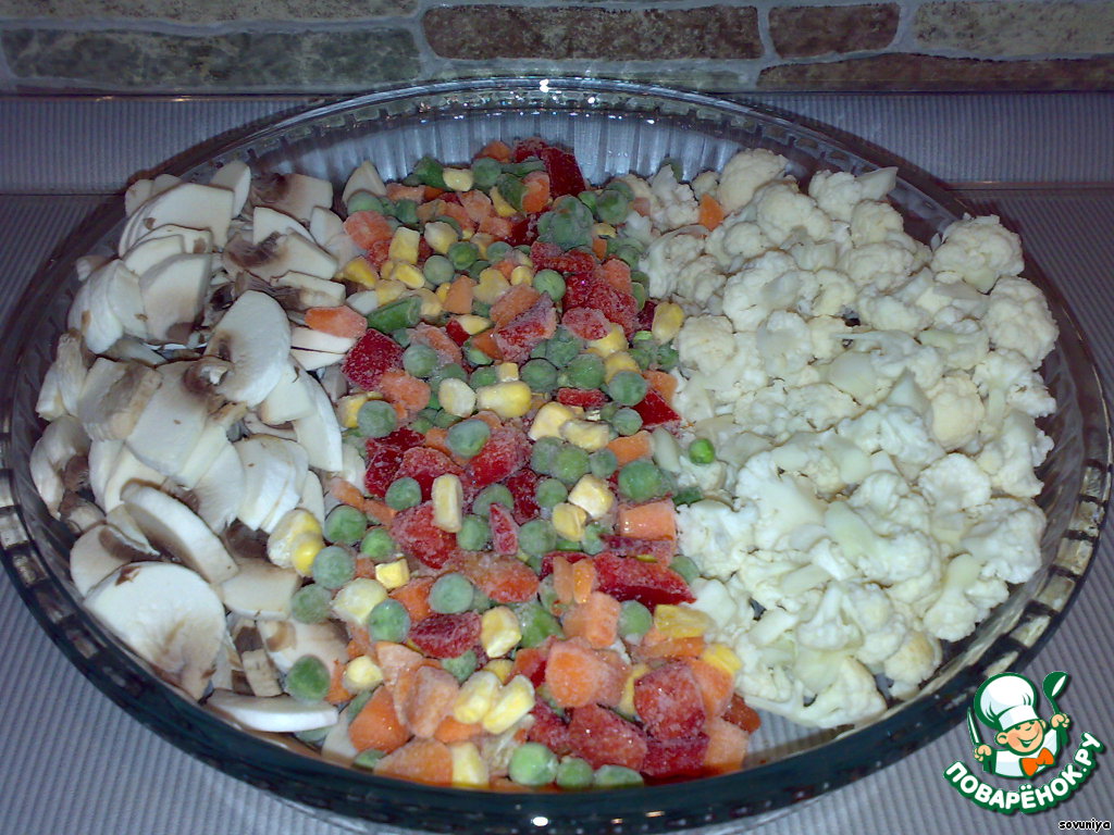 Цветную капусту разбираем на мелкие соцветия, грибы нарезаем пластинками, добавляем овощную смесь /можно не размораживать/, пассеруем овощи и грибы - я делаю это в микроволновке. -