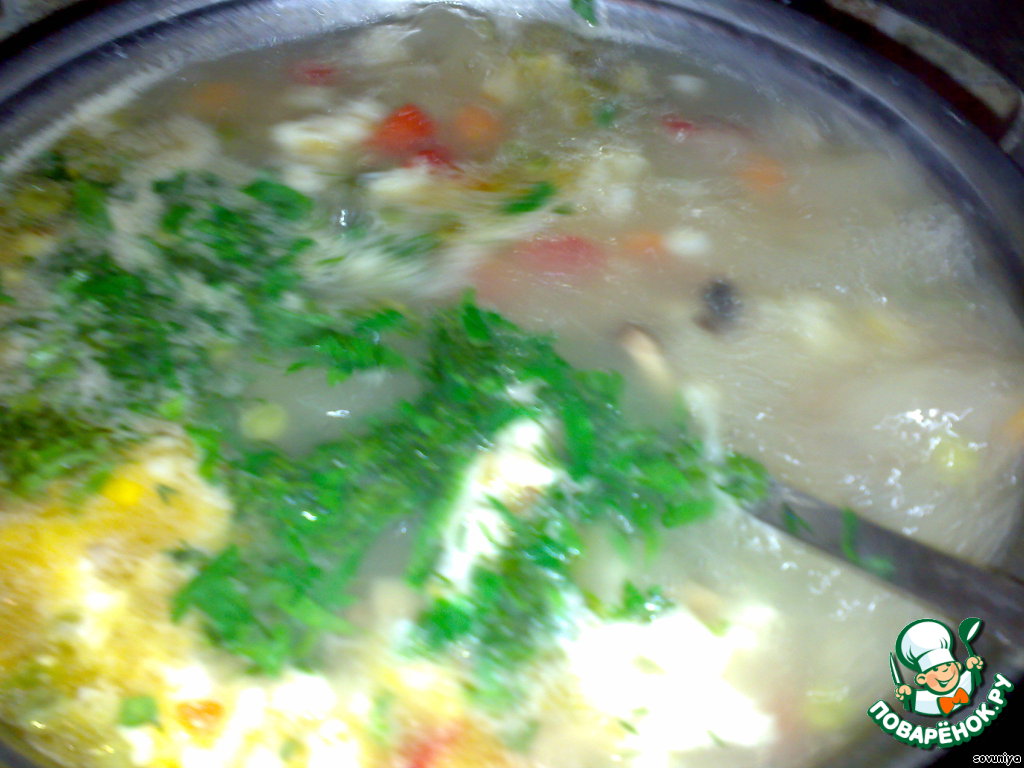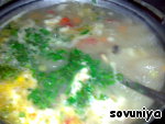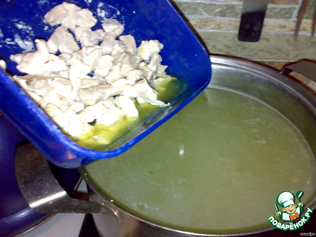 Бульон процеживаем, добавляем грудку и овощи, кипятим 5 минут, добавляем сыр и нарезанную зелень.