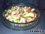 Достаём овощи - пусть ждут своего часа - и занимаемся грудкой. Удаляем кожу, режем на мелкие кусочки, добавляем 2 ст.л. масла накрываем крышкой и помещаем в микроволновку на 5-7 минут /1 раз перемешиваем/.