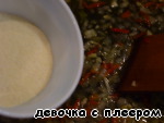 Влить к овощам бульон, дать ему закипеть и тонкой струйкой ввести манную крупу, постоянно помешивая.