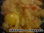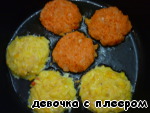 Варить манную крупу на очень маленьком огне в течение 5 минут, постоянно помешивая. Затем ввести в манно-овощную смесь яйцо. Хорошо перемешать и разделить манную смесь на 2 части.
