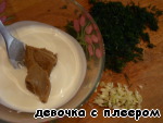 Этим временем делаем соус: смешать майонез с йогуртом, добавить горчицу, мелко рубленную зелень и измельченный чеснок. -